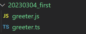 에디터에서, greeter.ts 파일에 다음의 JavaScript 코드를 입력