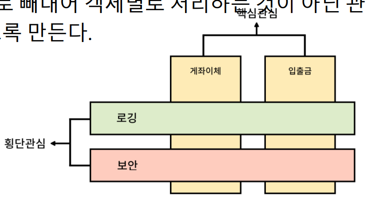 일반적으로 계좌이체때 보안 넣고 입출금때 보안작업을 넣을것같지만, 공통관심(공통적으로 해야하는 작업)을 따로 빼내서 외부에서 접근하도록 만든 것이 관점지향프로그래밍입니다.