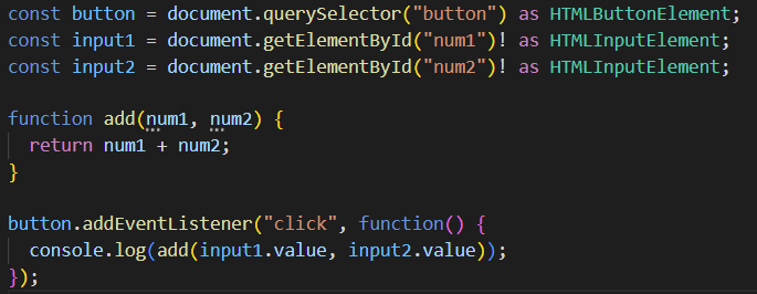 또한 이것이 항상 input 요소이기 떄문에 형 변환인 HTMLinputElement로 사용할 수 있음을 알려줌