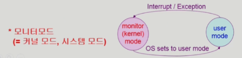 | 즉 모니터 모드는 모든 가능, i/o 디바이스 접근 가능 | 제한된 인스트럭션만 실행 가능 ( 보안상 이유 ) |