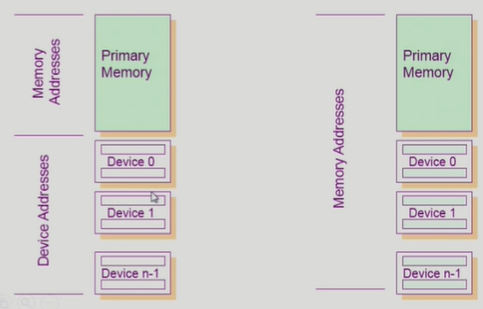 메모리 접근 주소 따로 I/O 디바이스 접근하는 주소가 달라서 따로하는 것이 일반적인 방식