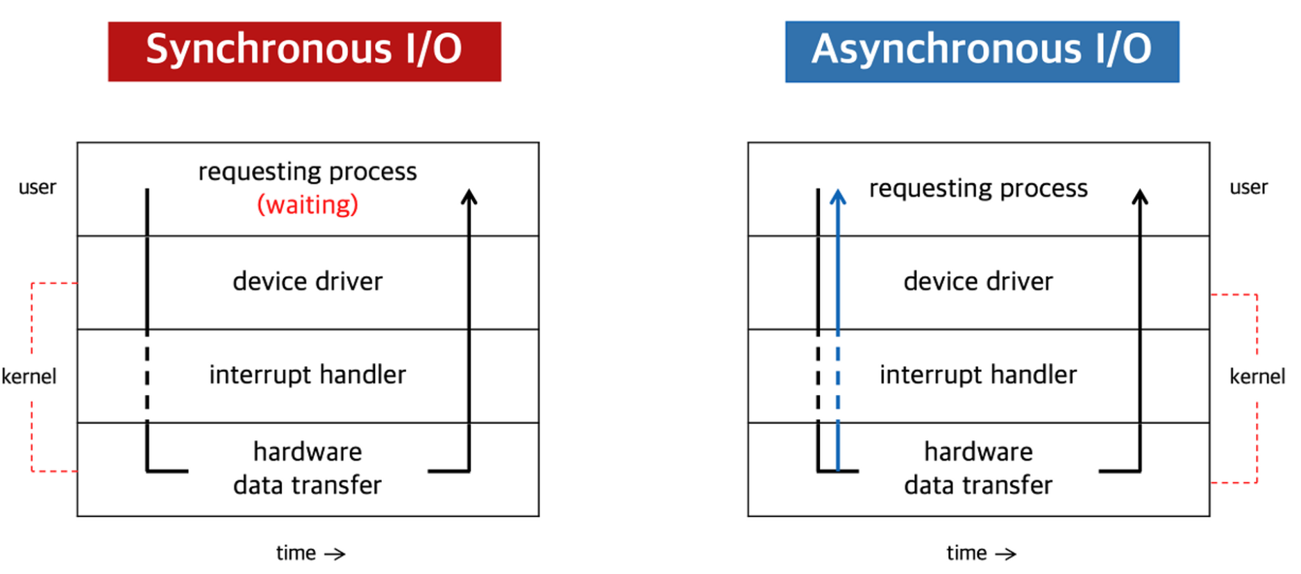✅ 두 경우 모두 I/O의 완료는 인터럽트로 알려줌