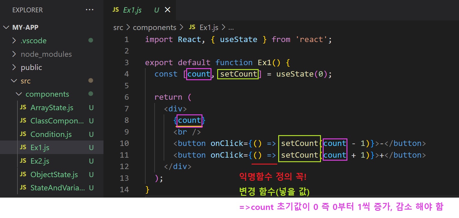 1. 상태를 관리하는 state를 배열의 첫번째로 정해주고, 해당 state를 변경 할 수 있는 함수를 두번째로 지정함