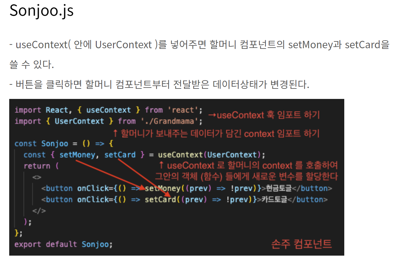 useContext 란 context 를 사용할 때, (즉 할머니 컴포넌트가 특정 손주 컴포넌트 한테만 다이렉트로 데이터(용돈)를 쏴주려고 할 때) 그 귀여운 손주는 useContext 라는 훅을 사용해서 할머니의 데이터(