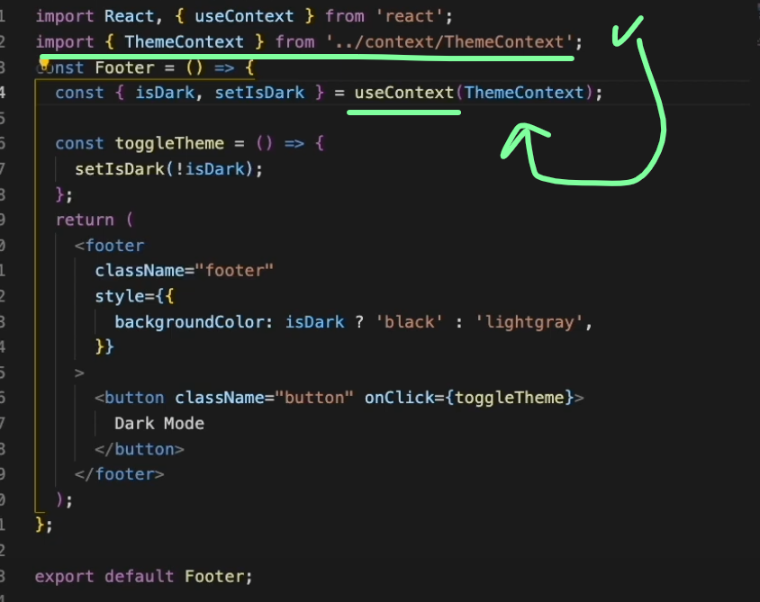 - useContext 선언하며, 인자로 ThemeContext 을 받아온다.