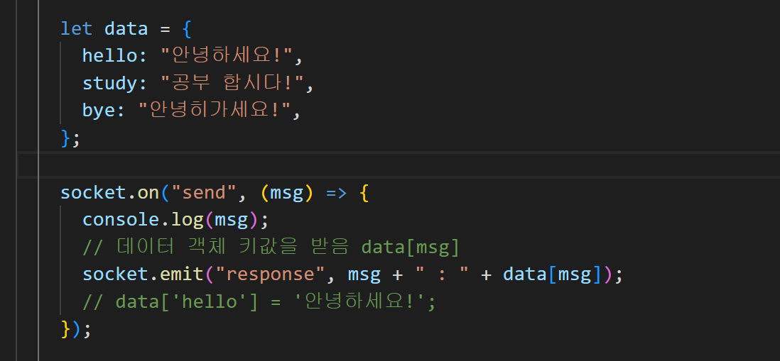 socket.on('이벤트명', (data) => { } ) > data 받을때는 콜벡함수로 받는다.
