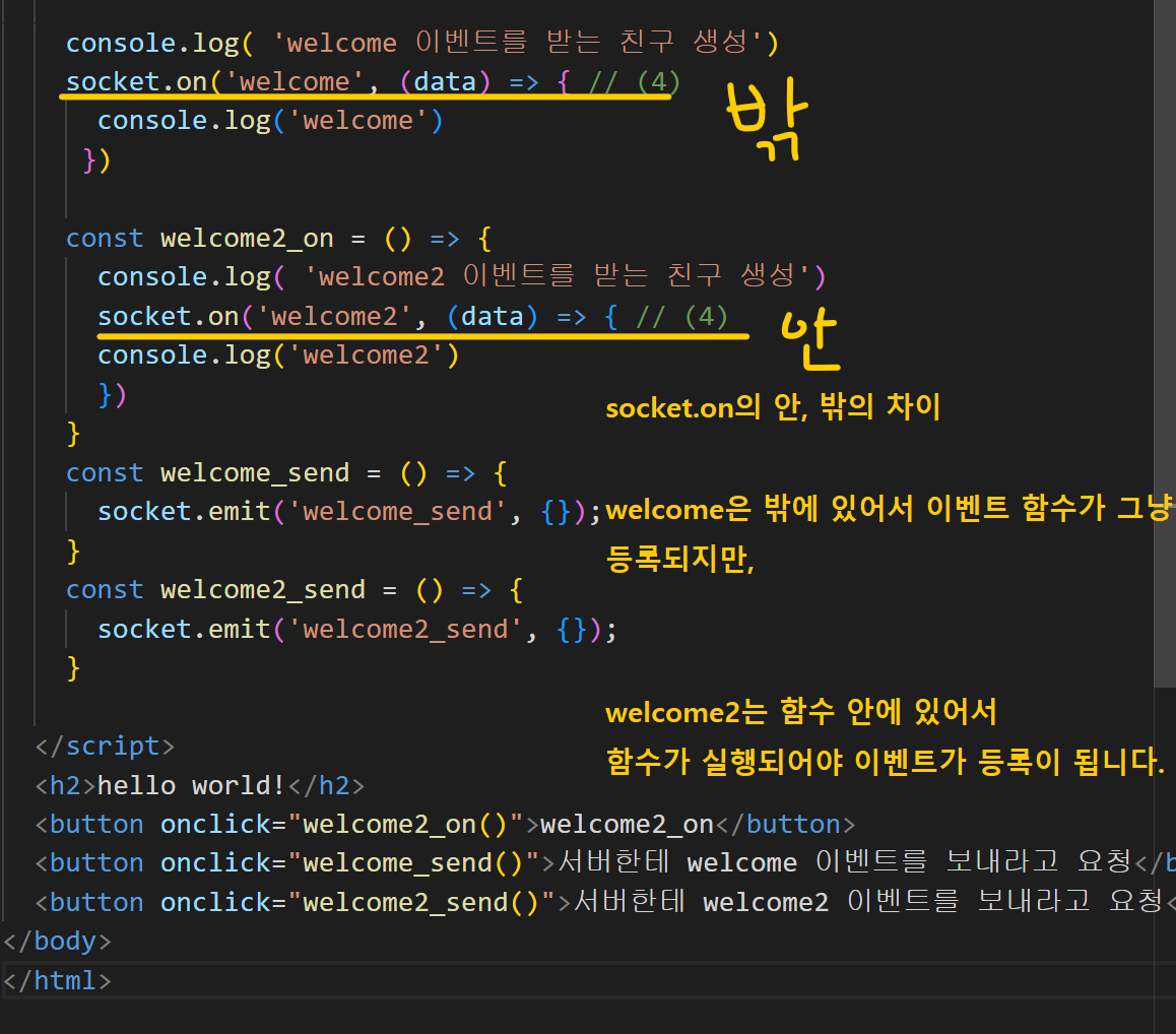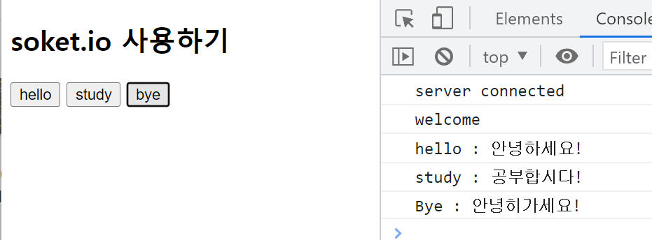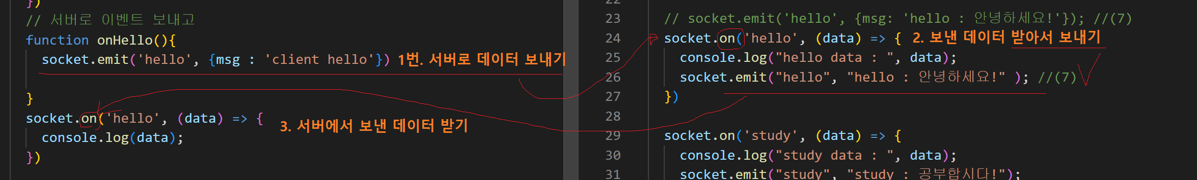 socket.emit("hello", "hello : 안녕하세요!" ); //(7)