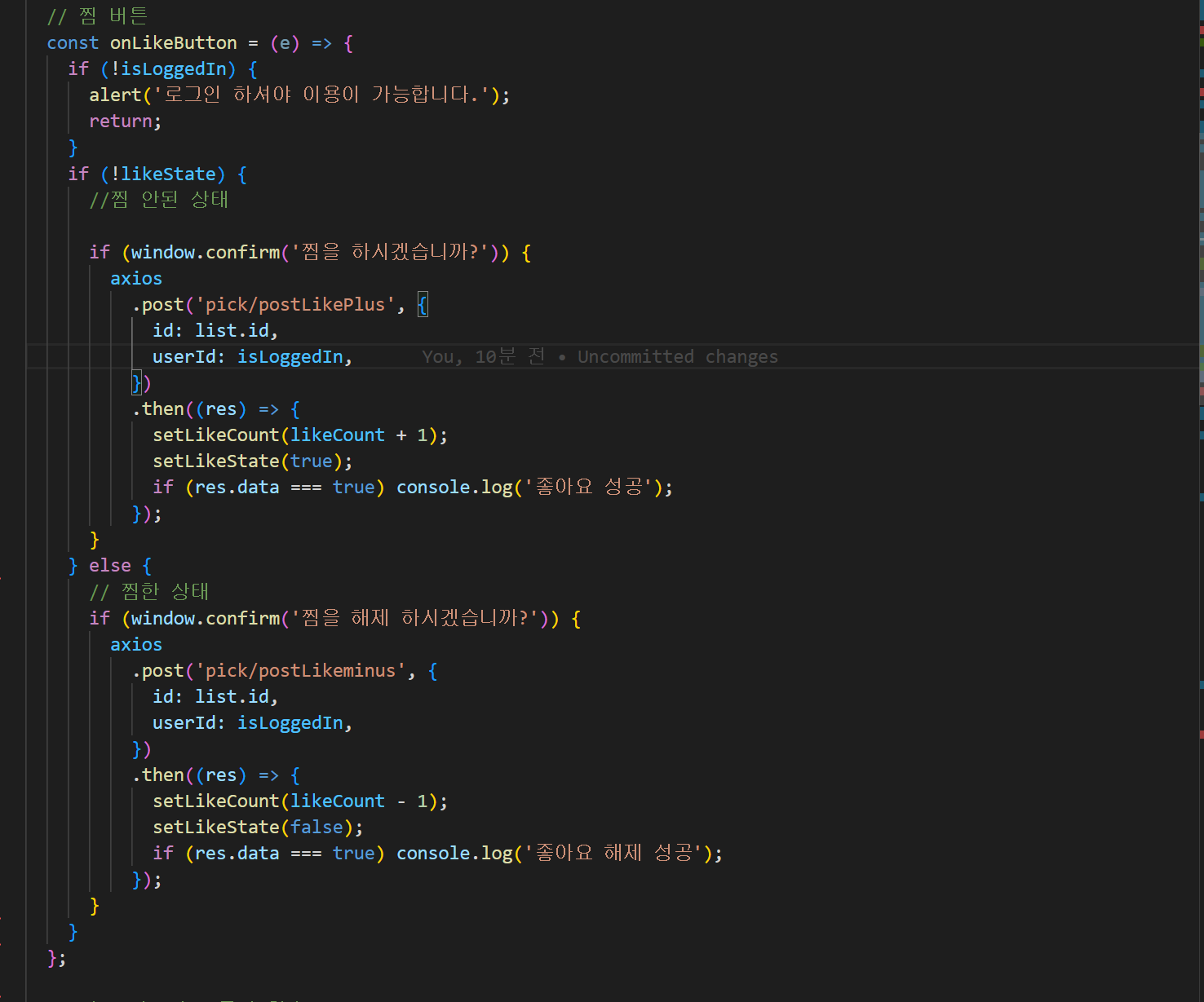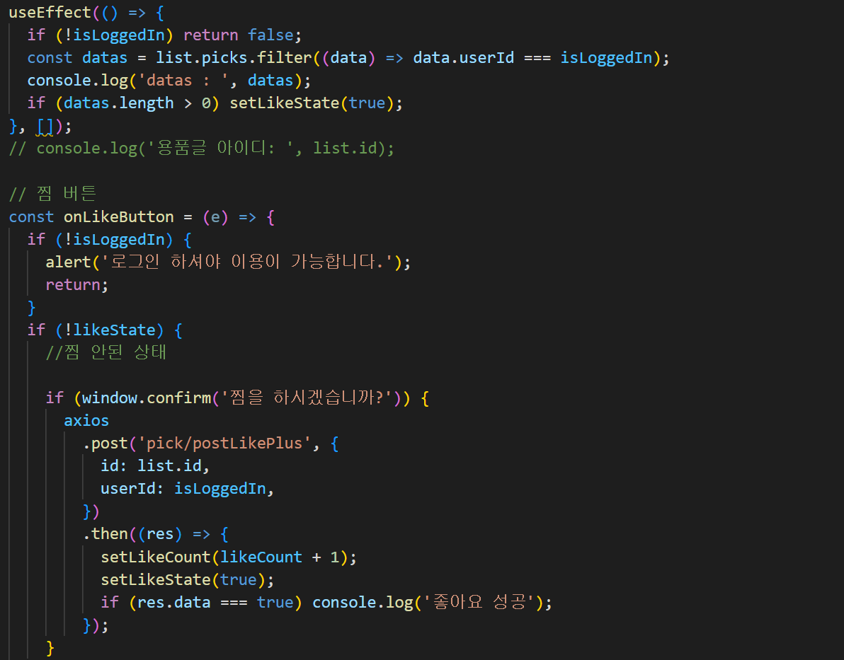 - setLikeState ( true ) ; => 내가 찜한 값이니 true로 바꾼다.