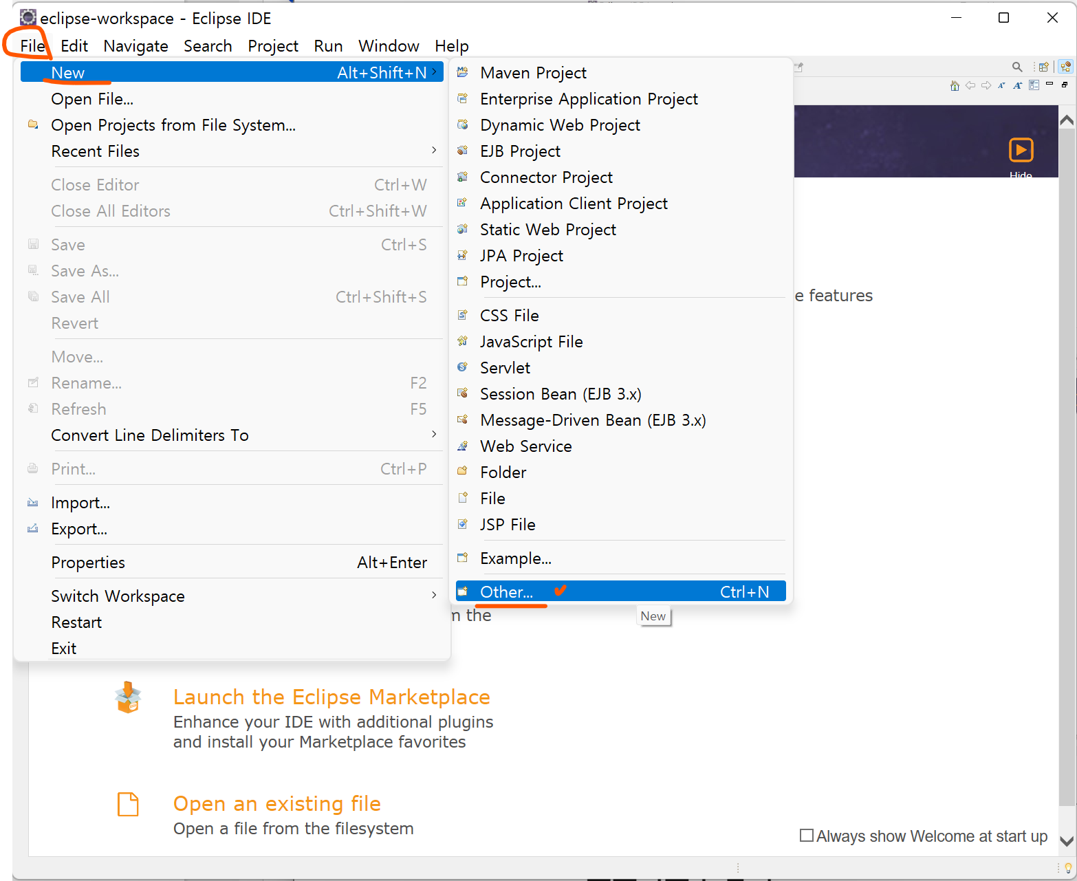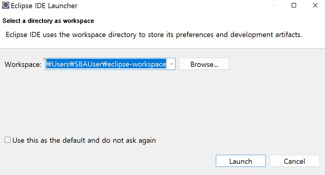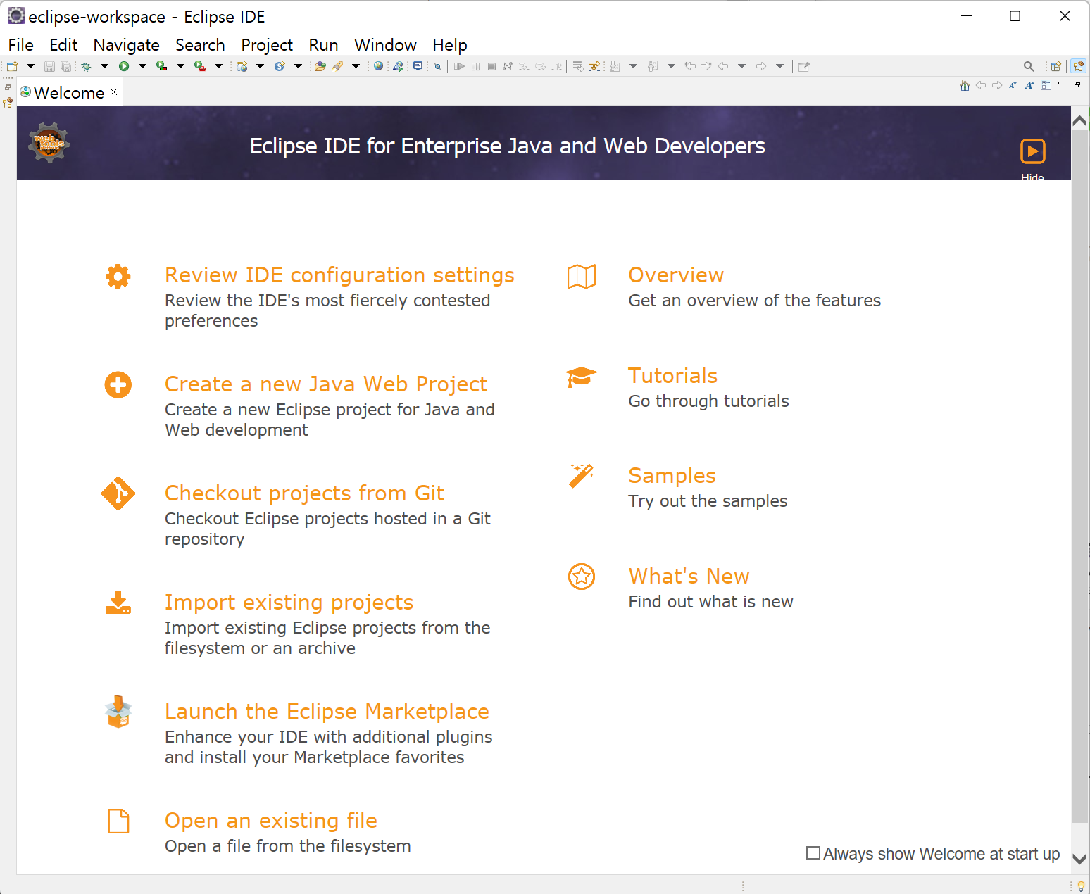 아래와 같이 eclipse IDE가 실행된다면 성공