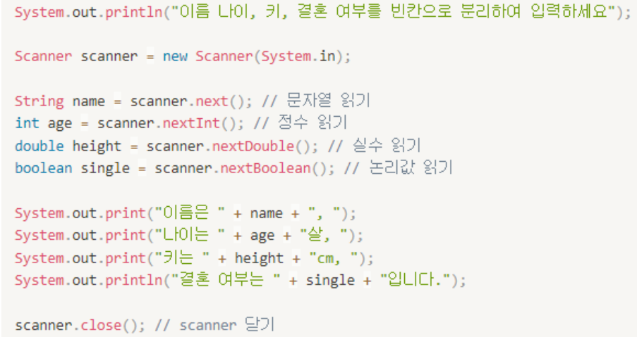 // System.out.println("이름, 나이, 키, 결혼 여부를 입력해주세요.");