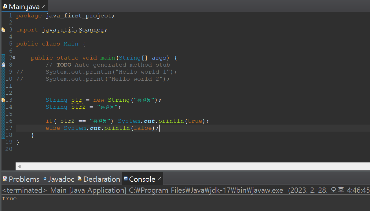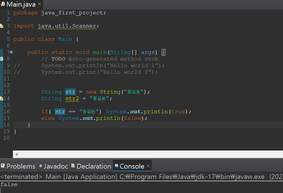 if( str2 == "홍길동") System.out.println(true);