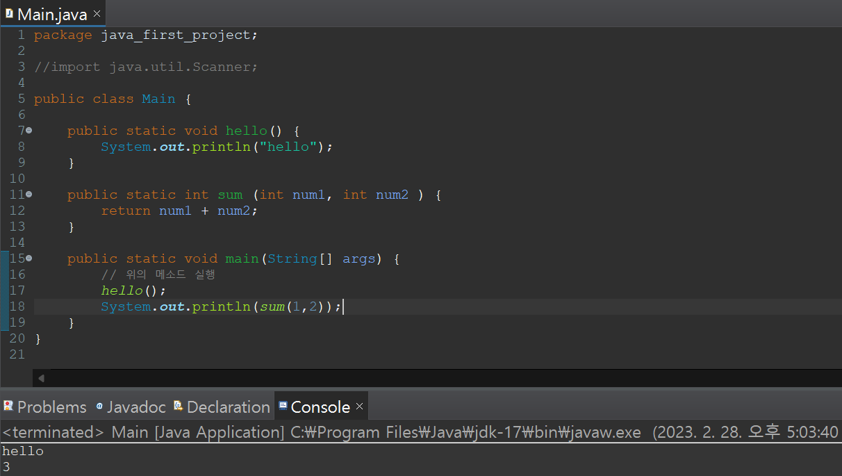 메인 메소드 밖에서 두 메소드를 만들고, main 메소드에 실행 시켰다.
