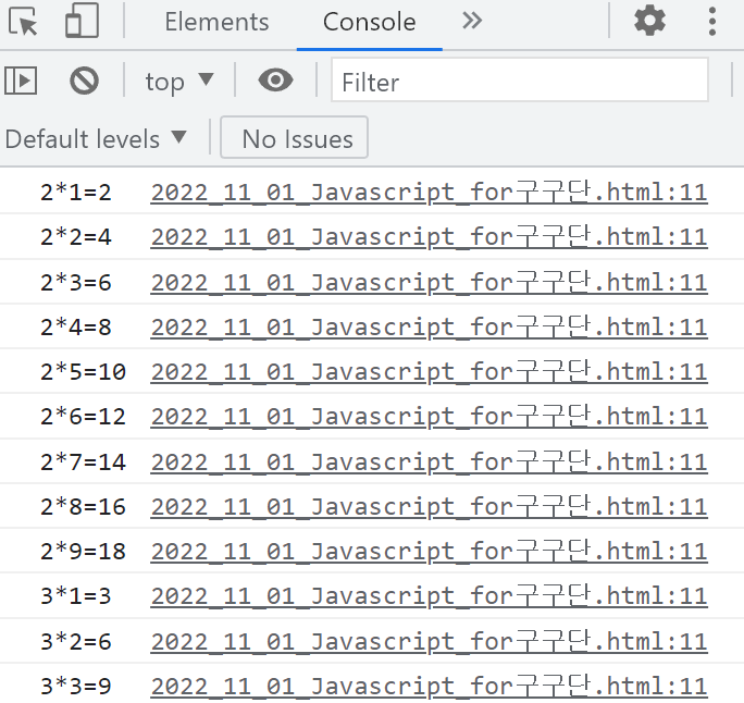 for ( var a=2; a <= 9; a ++ ) { 변수 a는 2, 9보다 같거나 작아야한다, a +1씩 증가한다.