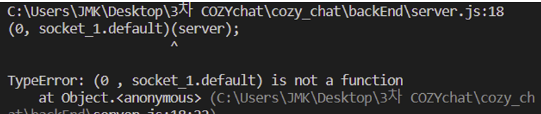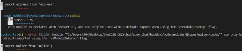 server.ts:3:8 - error TS1259: Module '"C:/Users/SBAUser/Desktop/\uC6A9\uC0B0 3\uCC28 \uAC1C\uC778/chat/node_modules/@types/cors/index"' can only be default-imported using the 'esModuleInterop' flag 3 import cors from 'cors';