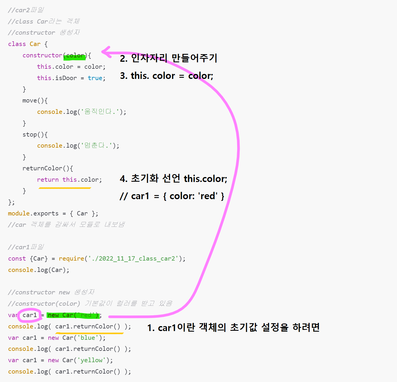 - 그리고 this. 로 접근해서 키 값을 할당 ( this.color = color; )