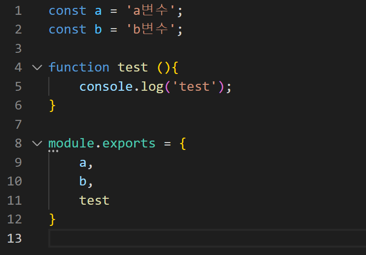 첫번째 파일 변수 a, b와, test함수를 객체 exports에 담음