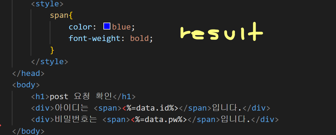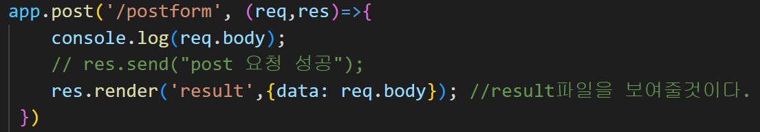 res.render (서버의 응답을 보여주겠다 'result'파일로 , {data : req:body}); 데이터란 객체에 클라이언트에게서 받은 정보를 넘겨 주겠다.