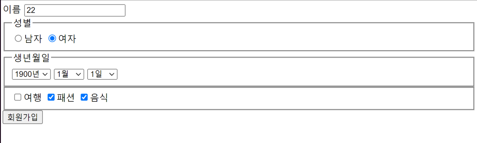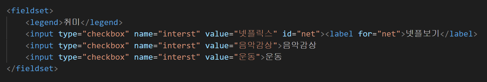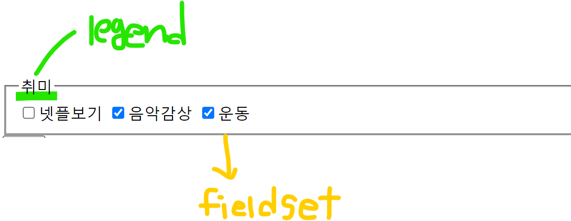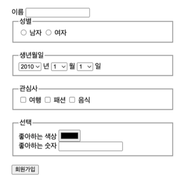 - <legend> 태그 : fildset 태그 안에 들어감, 목적에 맞게 이름을 지정 할 수 있다.