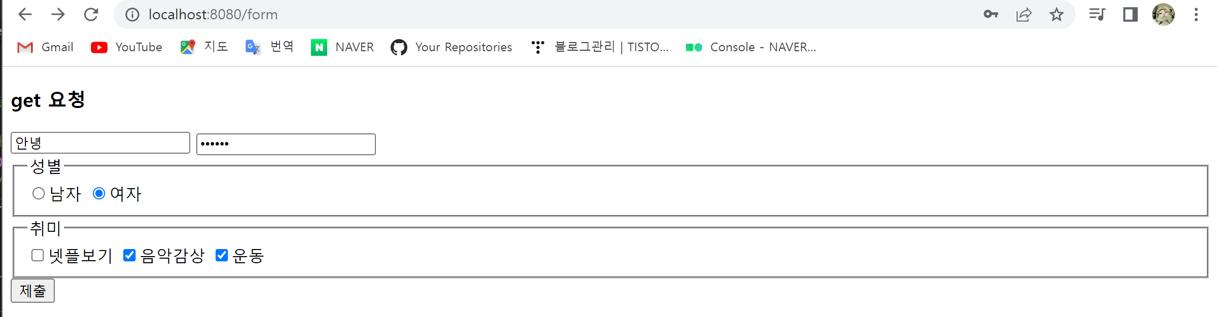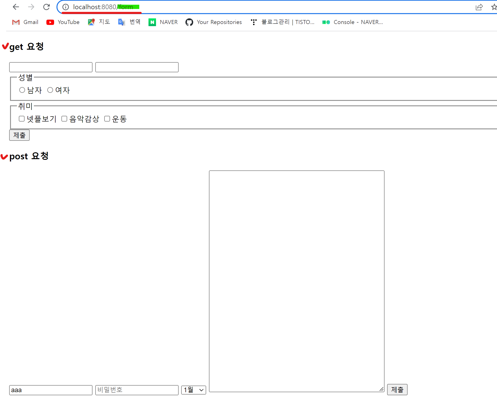 1. localhost:8080/form 에서 get 속성인 form에 클라이언트가 정보를 전달하면