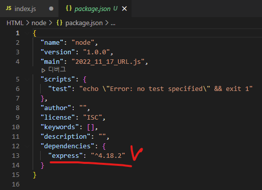 설치된 패키지의 이름과 정보는 package.json에 dependencies(express 값 추가)에 입력된다.