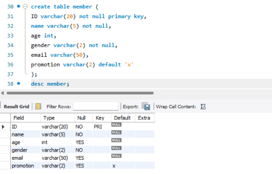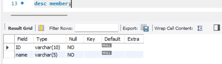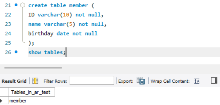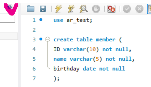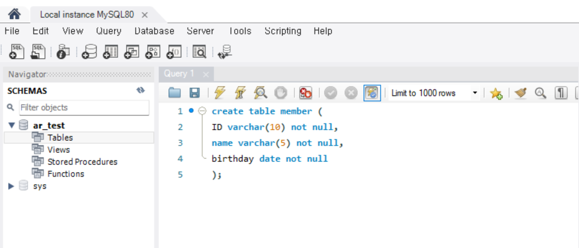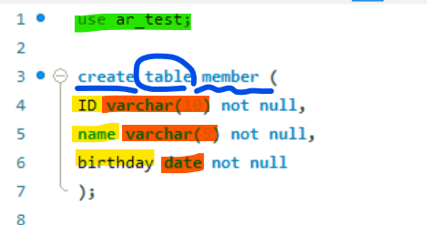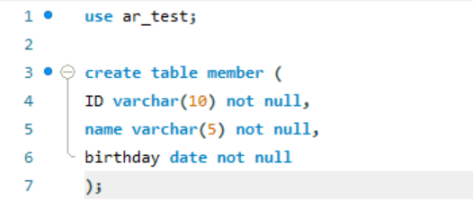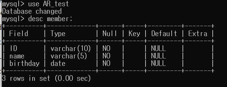 ar_test라는 데이터베이스에 member라는 테이블을 만들건데~!