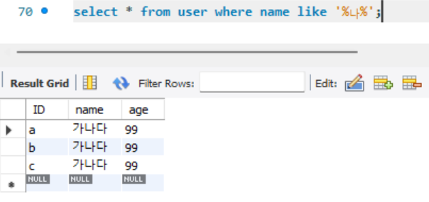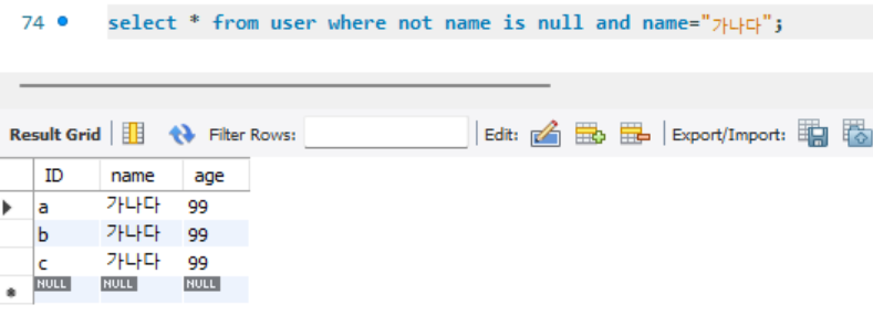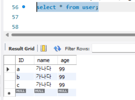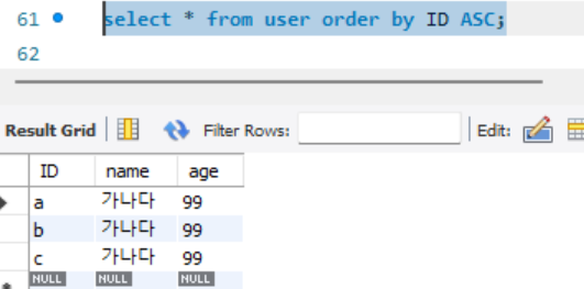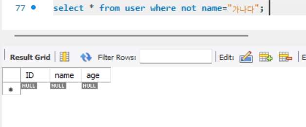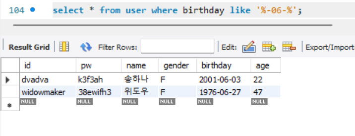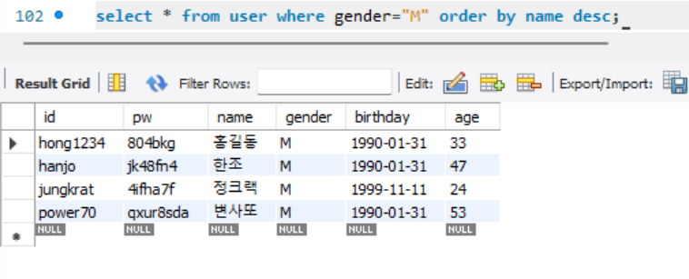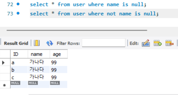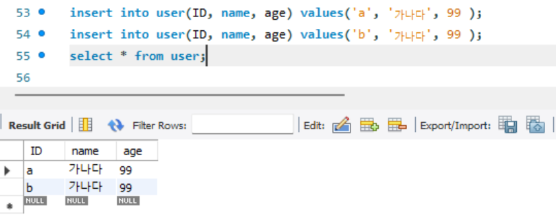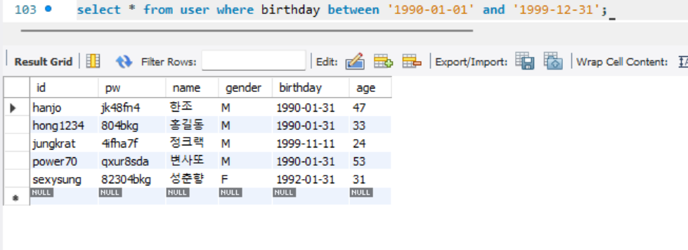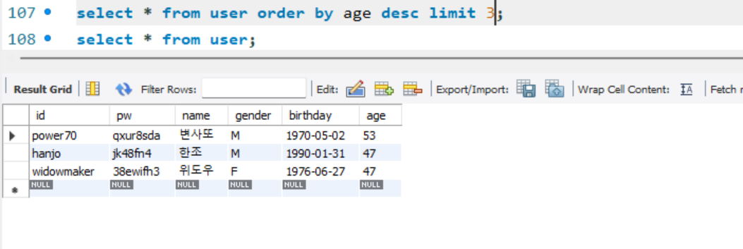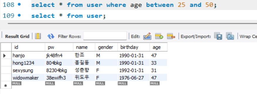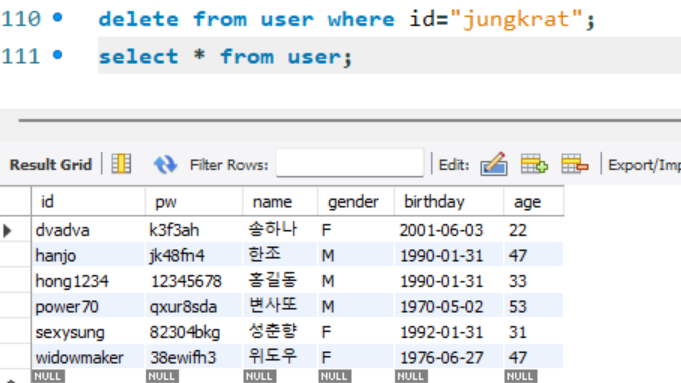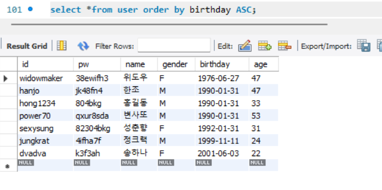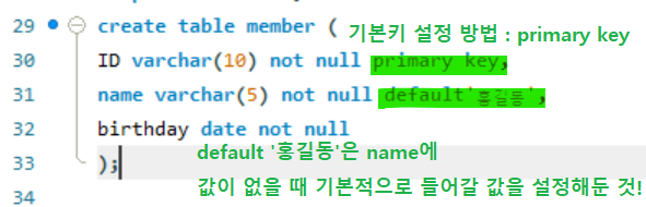 not null의미 id, name, birthday 이 값이 무조건 있어야 할 때! not null = 이 값은 절대 비우면 안된다.