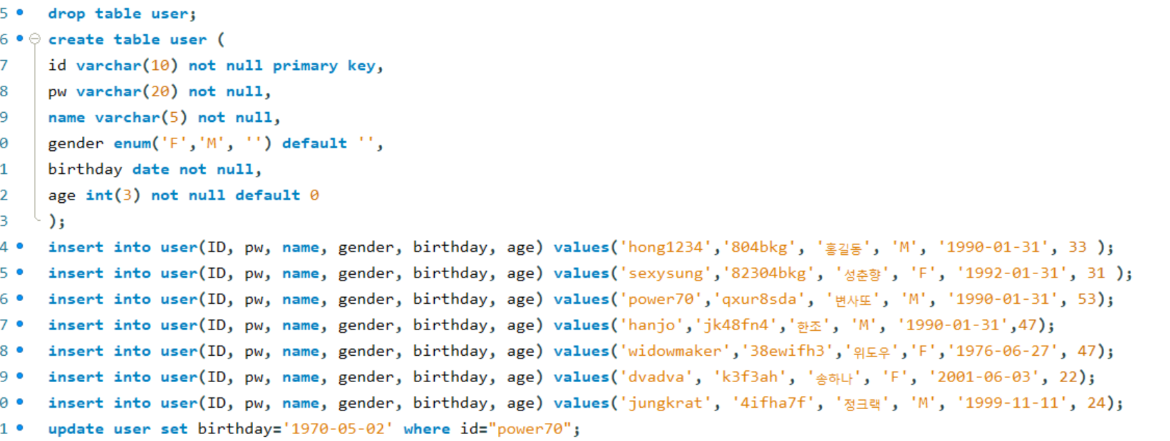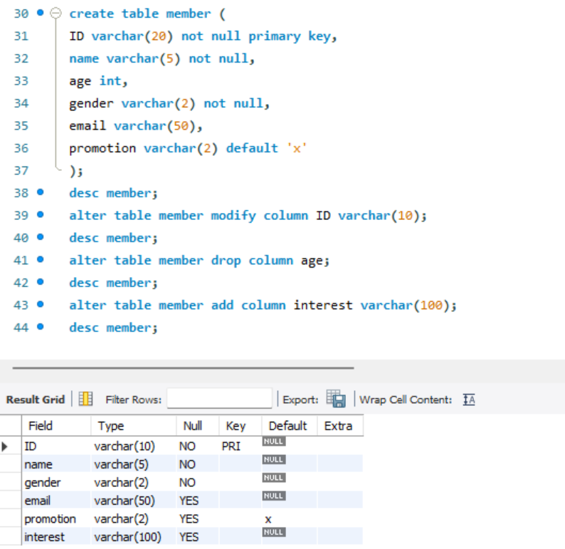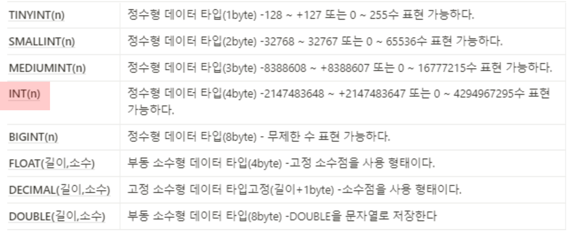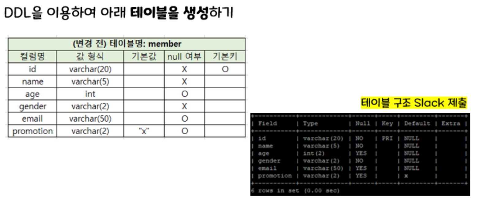 사용 예시 1 creat table member( name varchar(10), //멤버 테이블의 name은 문자열 최대 10글자 저장이 가능하다. gender varchar(2), // 남자, 여자 age int, //정수형 데이터 타입, 소수 = 실수 면 float, bouble등을 씁니다. registered timestamp //이 데이터가 저장될 때 시간을 registered에 자동으로 넣어준다. )