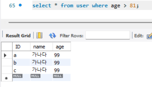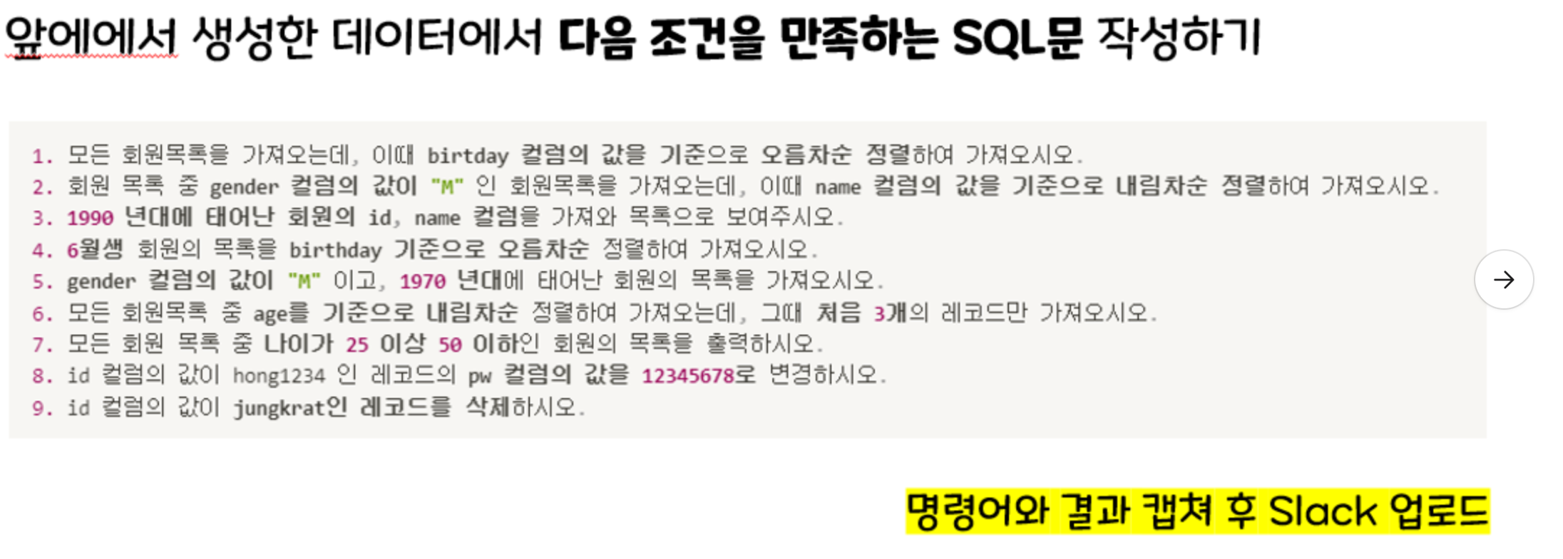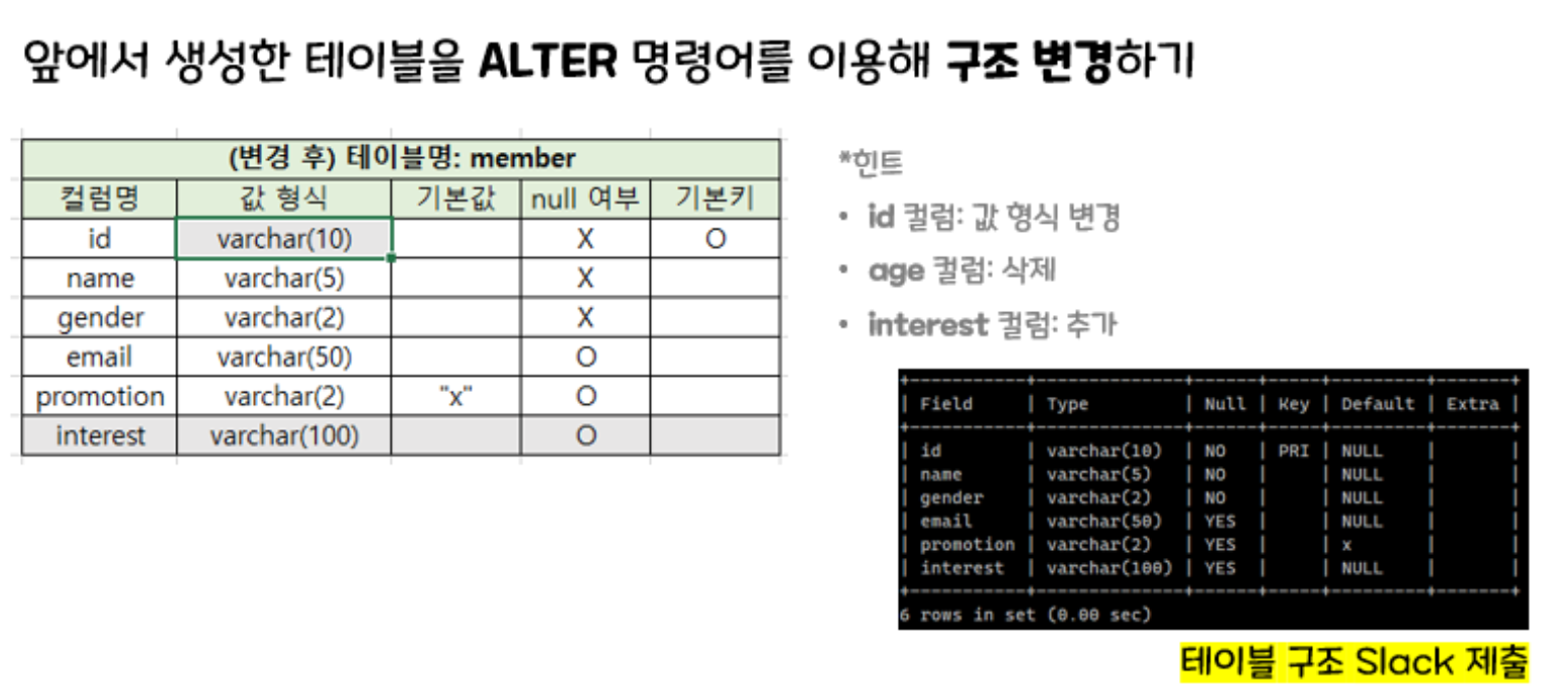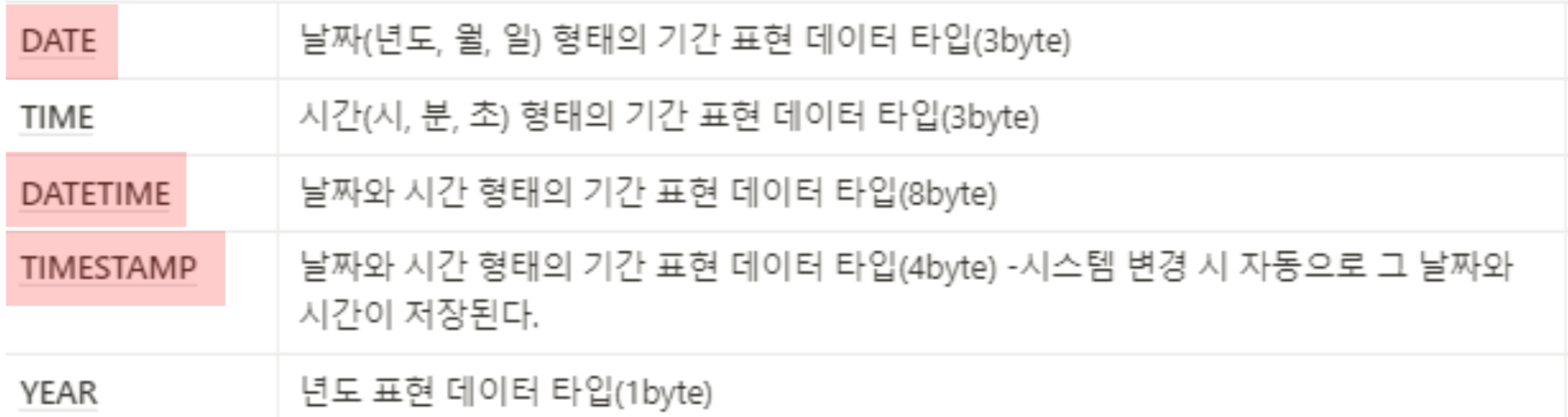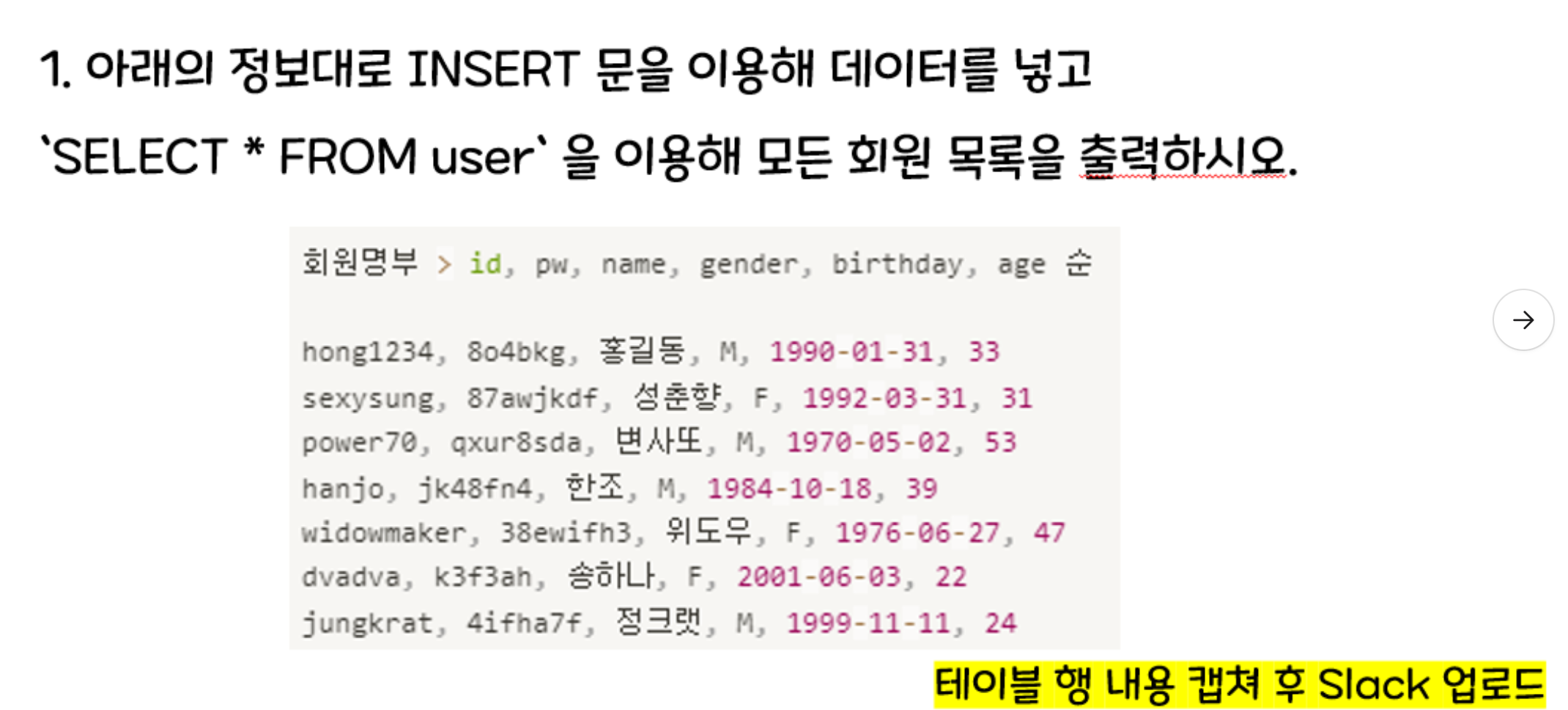 사용 예시 1 creat table member( name varchar(10), //멤버 테이블의 name은 문자열 최대 10글자 저장이 가능하다. gender varchar(2), // 남자, 여자 age int, //정수형 데이터 타입, 소수 = 실수 면 float, bouble등을 씁니다. registered timestamp //이 데이터가 저장될 때 시간을 registered에 자동으로 넣어준다. )