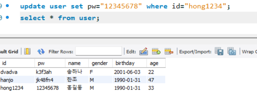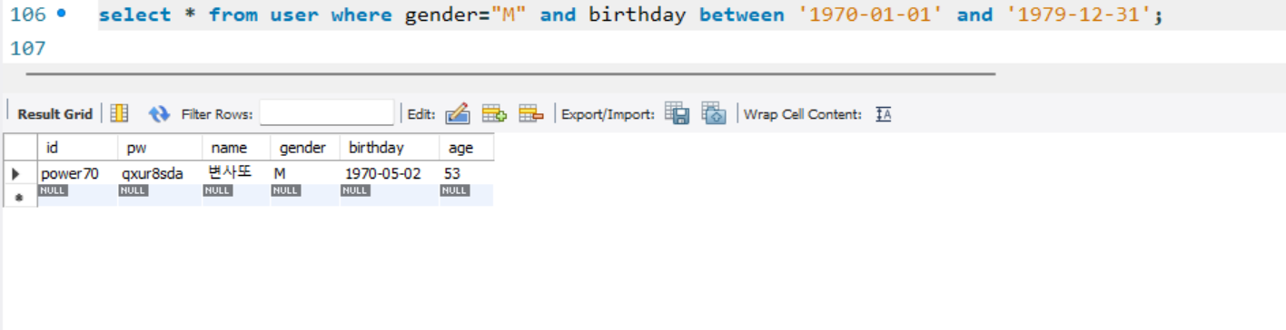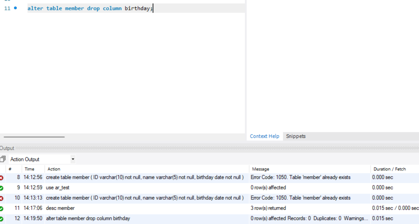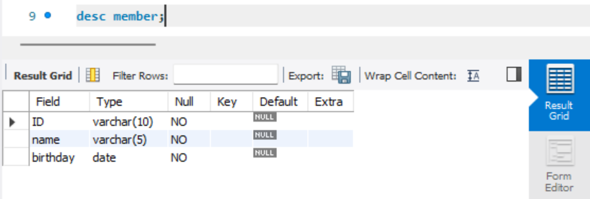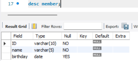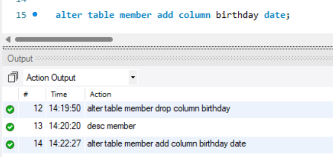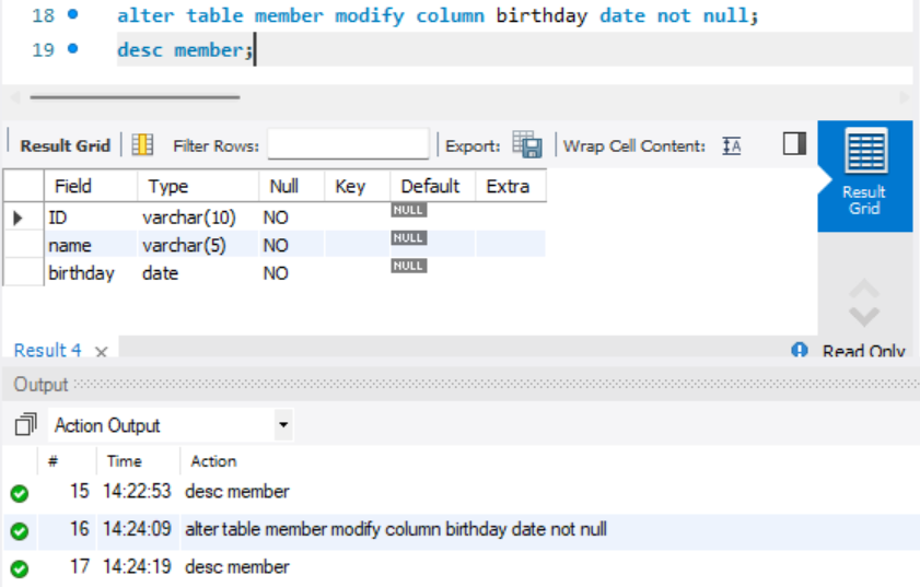 member 테이블을 수정한다. > 컬럼 brithday의 date 속성과 not null 속성으로