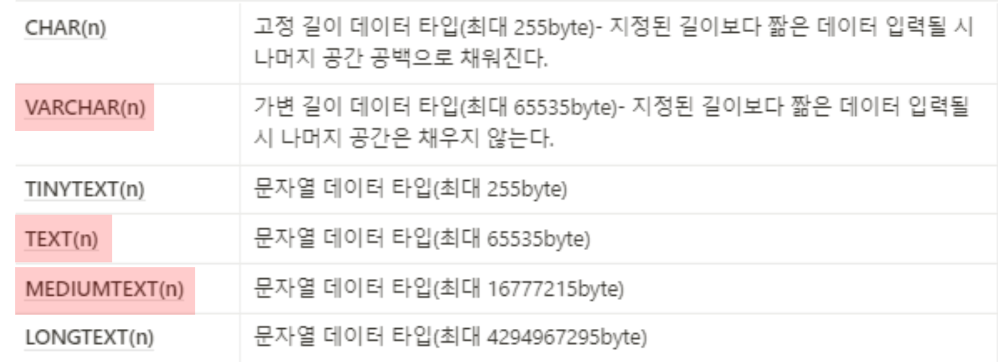 최대값 지정은 varchar (숫자) 해주면 되고 mediumtext, // 문자열 데이터 최대 길이가 정해져 있음