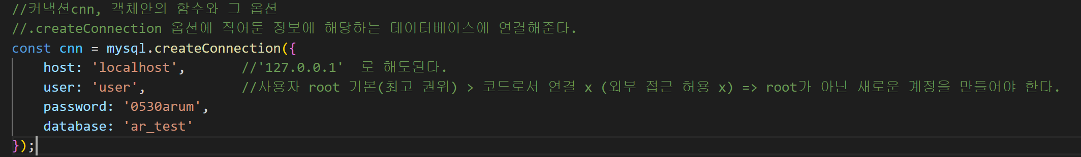 3.연결 기능을 넣어줄 객체 = mysql.createConnection({ })