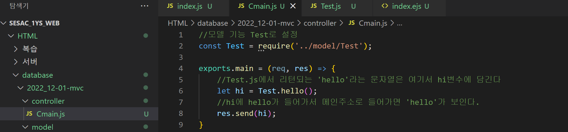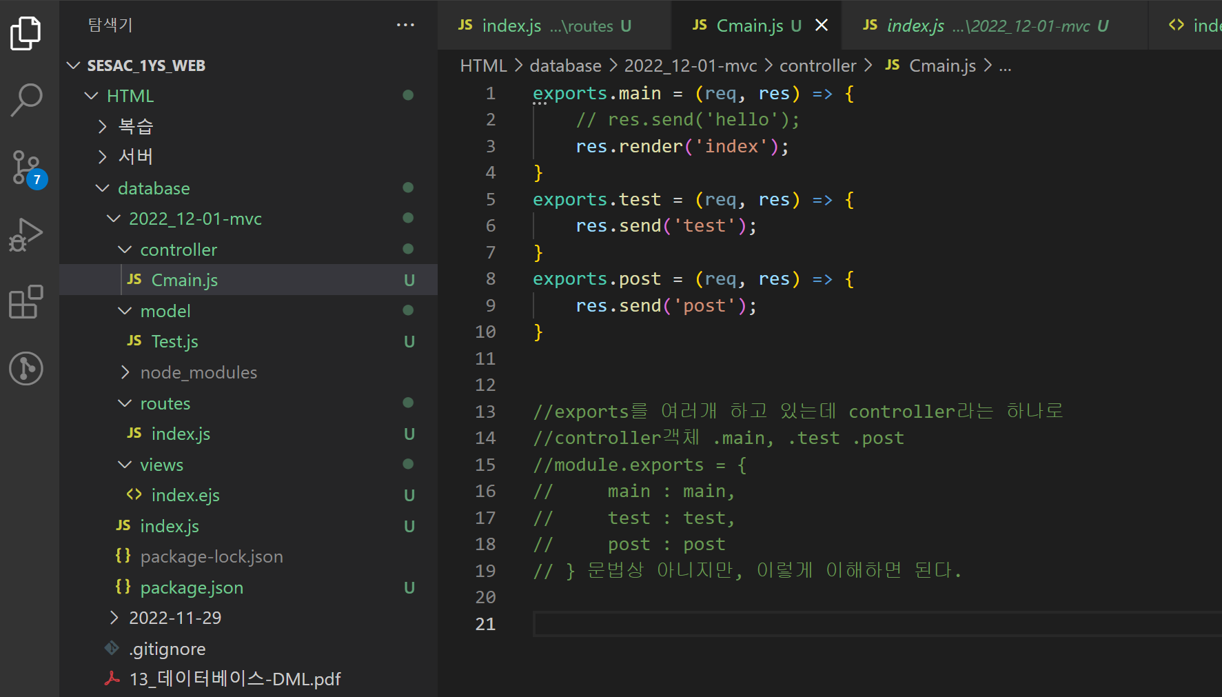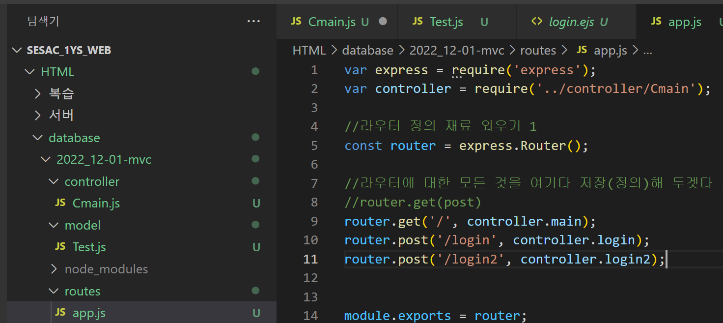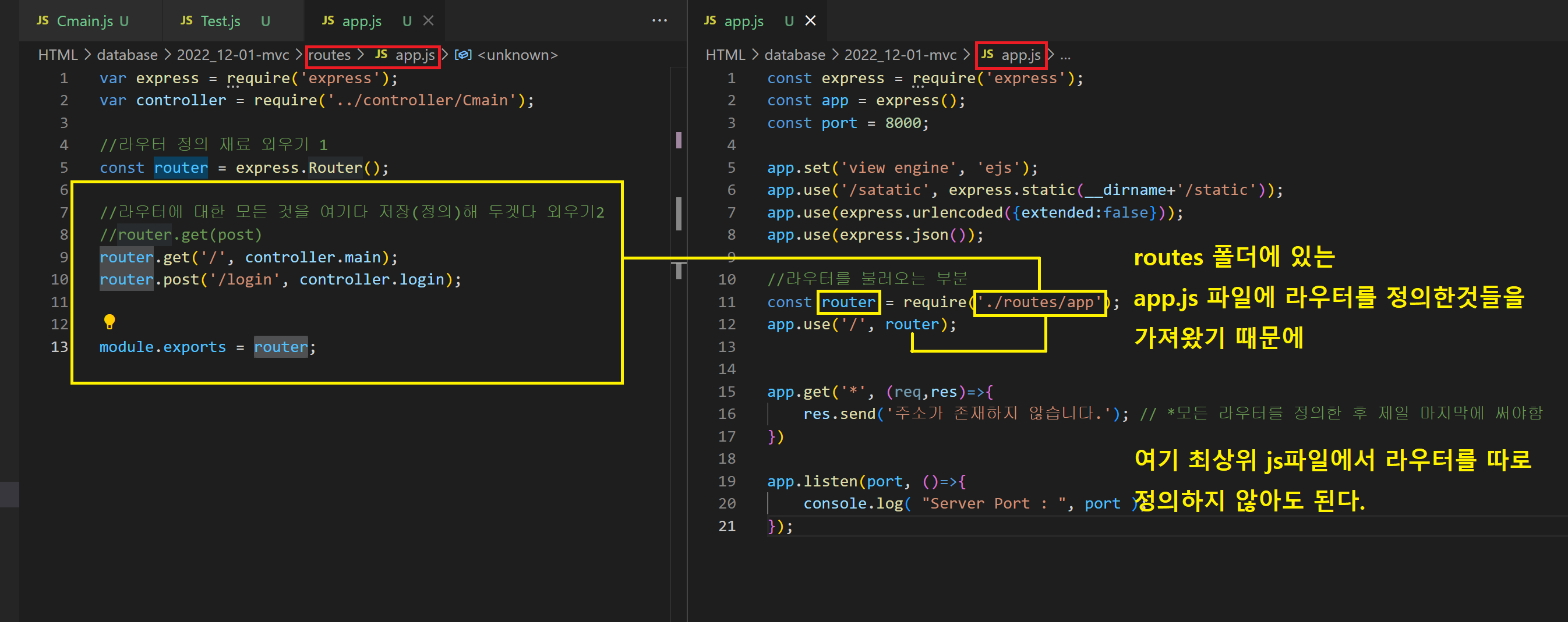 Cmain.js 파일 routes 폴더 파일이 끌어다 쓴다고 했다.