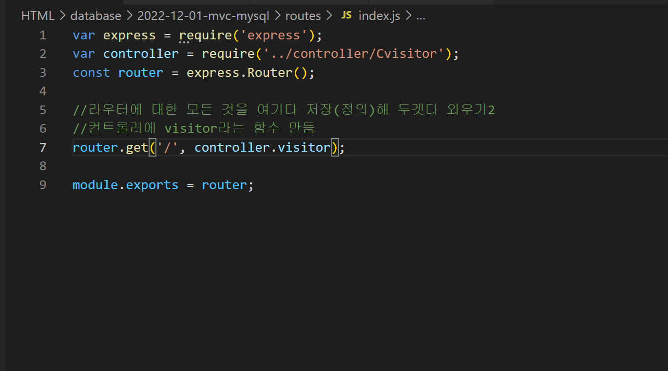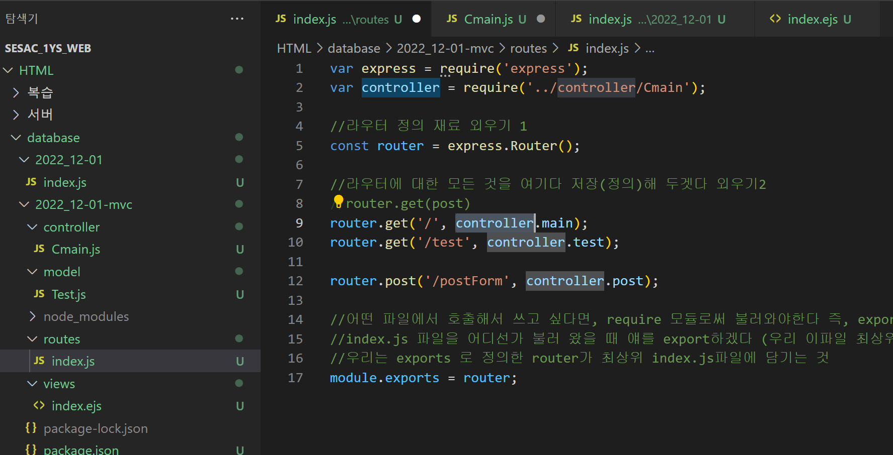 라우터가 보여줄 행위를 컨트롤러 폴더에서 한다고 require 하고 있다.