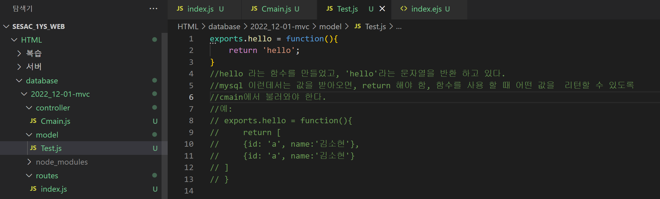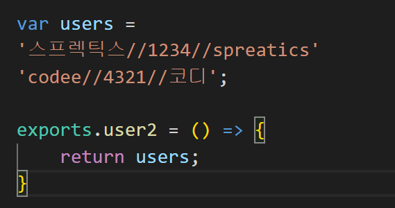 hello라는 객체에 'hello'라는 문자열을 반환하는 함수를 담고 exports로 처리 했다.