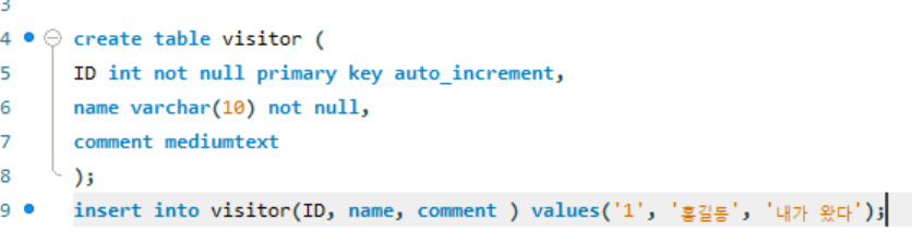 insert into visitor(ID, name, comment ) values('1', '홍길동', '내가 왔다');