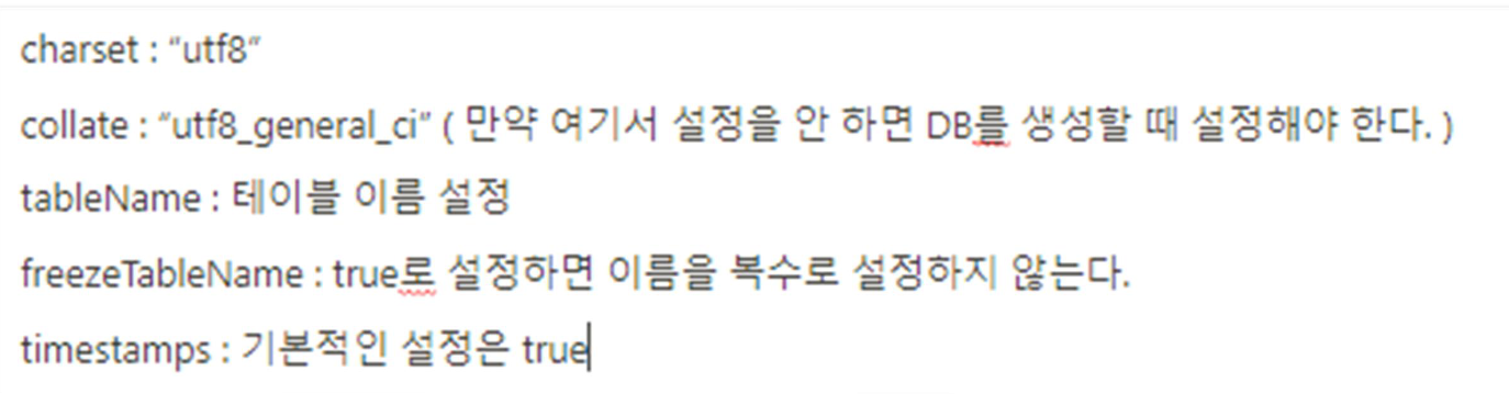 freezeTableName : true, //복수형태가 아닌 그대로 사용하겠다는 의미