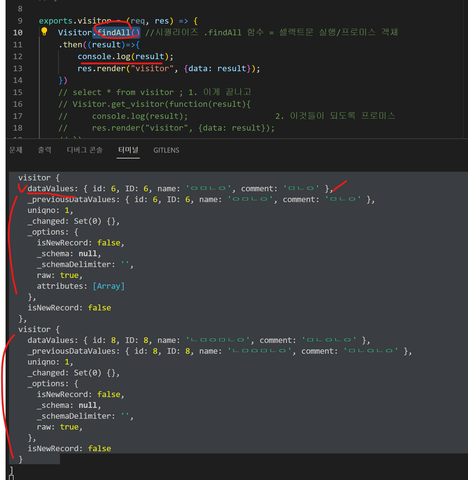 Visitor.ejs를 랜더하고 있는 곳에 보면, 모든 값들을 result에 넣고,