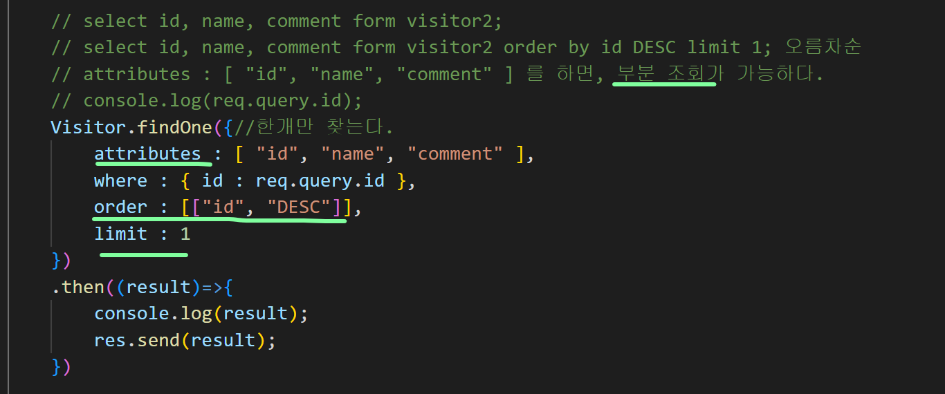 // attributes : [ "id", "name", "comment" ] 를 하면, 부분 조회가 가능하다.
