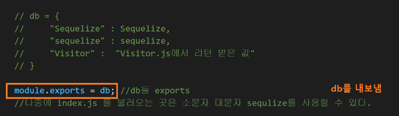 const db = { } 객체에 넣고, 마지막에 다른곳에서도 sequlize 객체를 사용하도록 db를 exports 하고 있다.