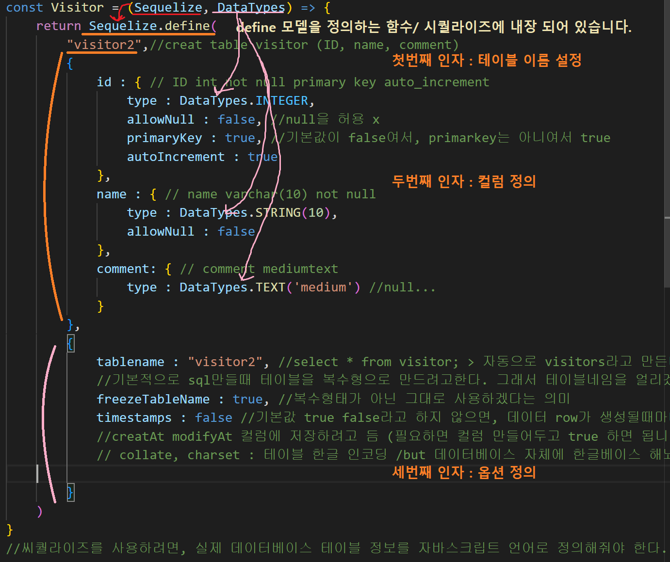 "visitor2", { 컬럼 정의 }, { 모델 옵션 정의 }