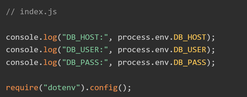 하지만, 같은 파일 내에서 dotenv 라이브러리의 config() 함수를 호출하기 전에 process.env를 읽으면 안 되니 주의하셔야 합니다.
