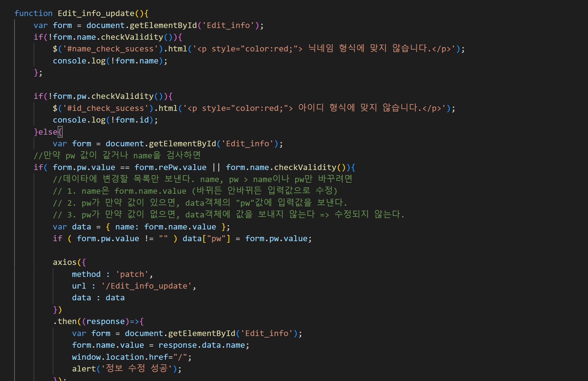 만약 폼의 pw가 같거나, form의 name을 검사했을경우