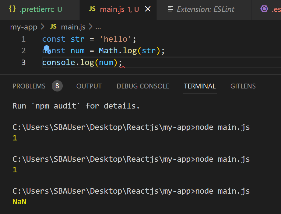 node main.js 로 하면 1이 뜨고 문제가 없으나.. 빨간줄 봅시다
