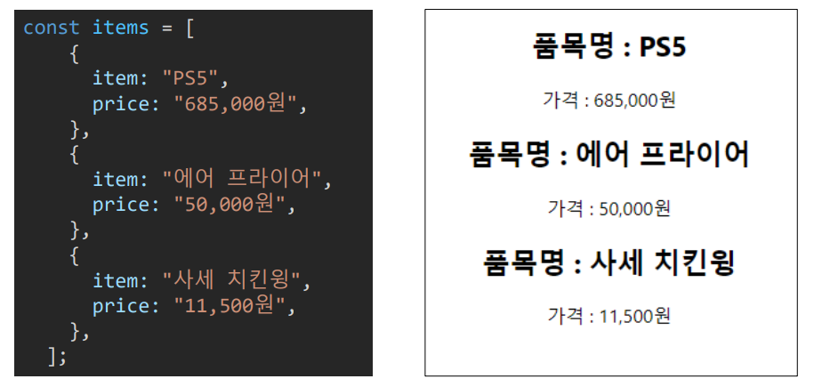 내용은 props로 전달하여 오른쪽 코드의 결과물과 같은 결과물이 나올 수 있도록 만들기