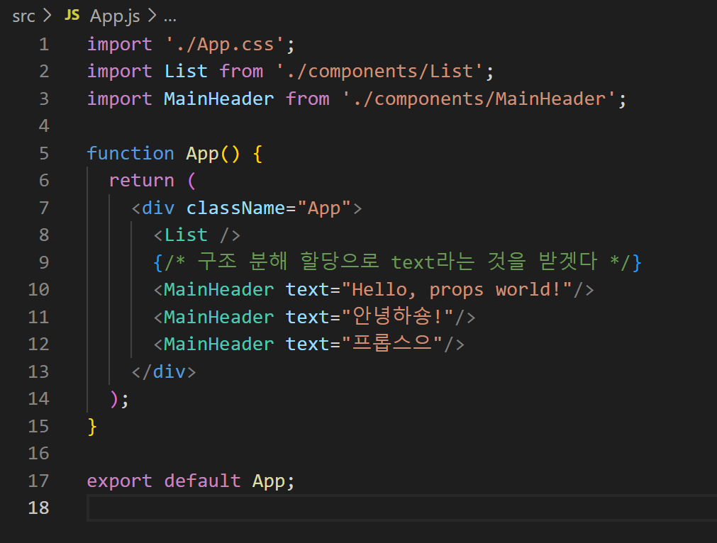 // 부모가 자식 컴포넌트에게 보내는 구조 메인헤더를 App.js..에서
