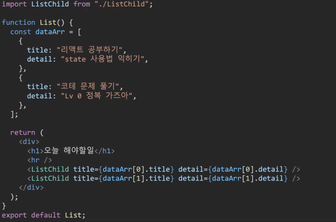 <List title="리액트 공부하기" content="스테이트 공부하기" />