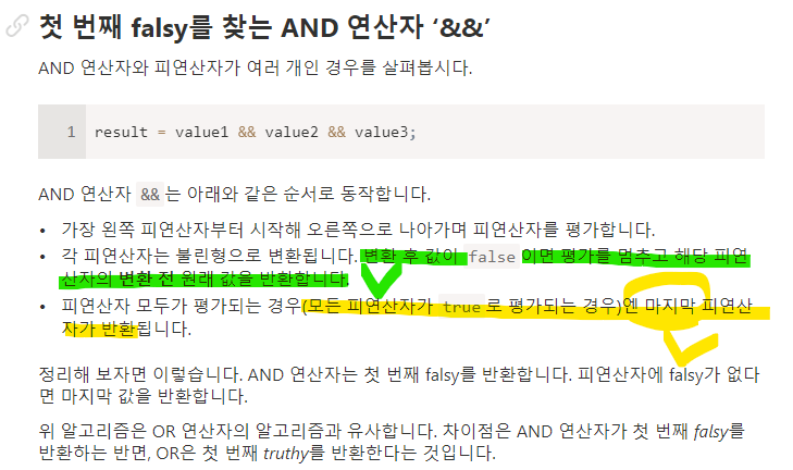 왼쪽 항이 거짓이면 falsy한 값 을 반환 / 둘 다 참일 경우 오른쪽 항을 반환 => 👌 맞다!!