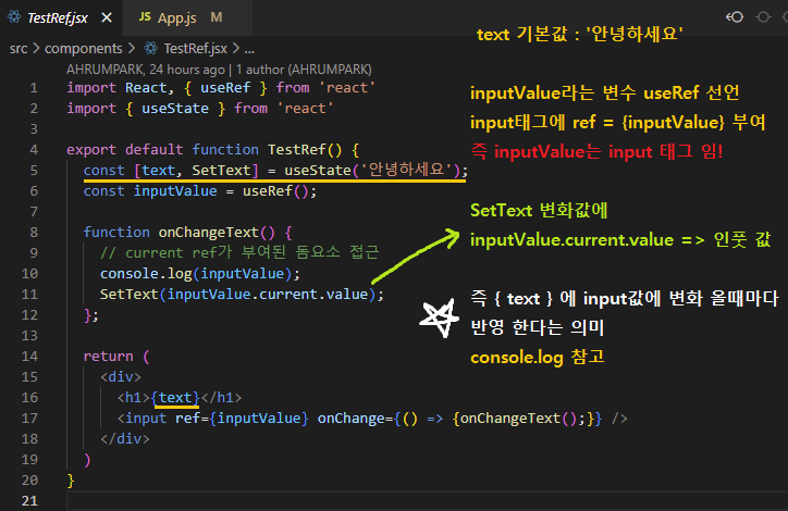 useRef로 설정한 값을 consol.log(ref.current.value)에 찍으면 값 확인 가능!