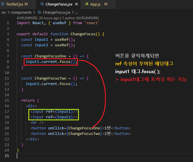 ref = { ref } 라고 지정한 부분은 { ref } 이것으로 요소를 컨트롤 할 수 있다.