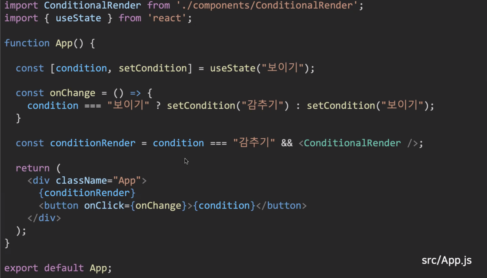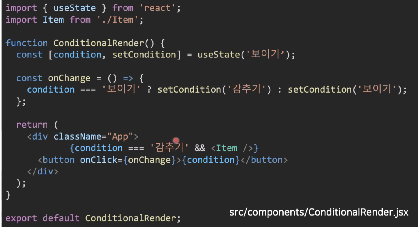 { codition === '감추기' && <Item /> }컨디션 값이 '감추기' true면 아이템 컴포넌트를 반환 !
